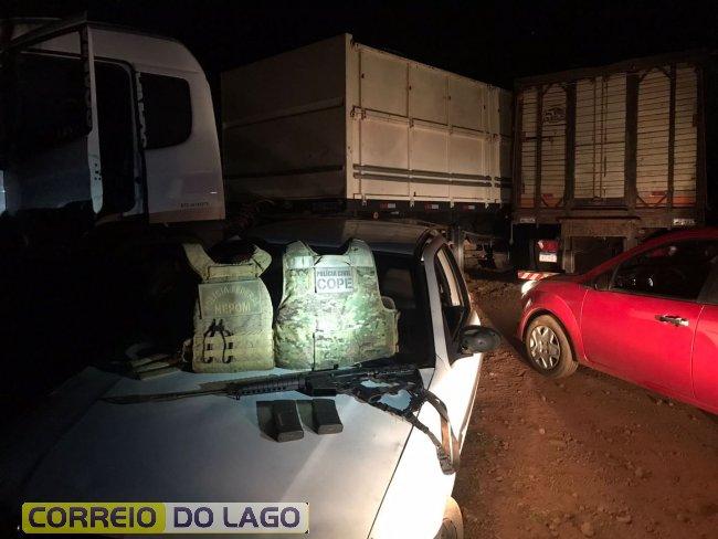 Foram encontrados no local diversos volumes contendo caixas de cigarros contrabandeados em dois caminhões, sendo uma carreta e um tipo boiadeiro, além de dois veículos, moto, três rádios comunicadores, além do fuzil e munição calibre 7.62.