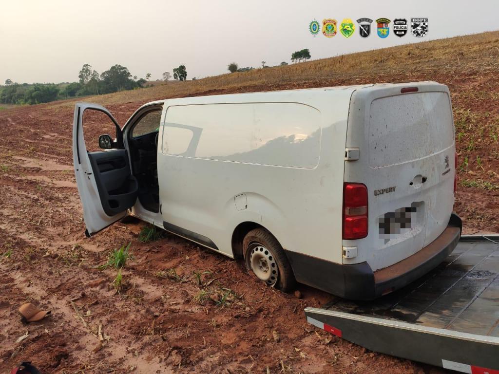 Na tentativa de abordagem, o comboio composto por diversos veículos de passeio começou a tentar fugir, mas a equipe policial realizou a prisão de dois criminosos, após o motorista jogar o carro pela lavoura e abandonar o veículo.