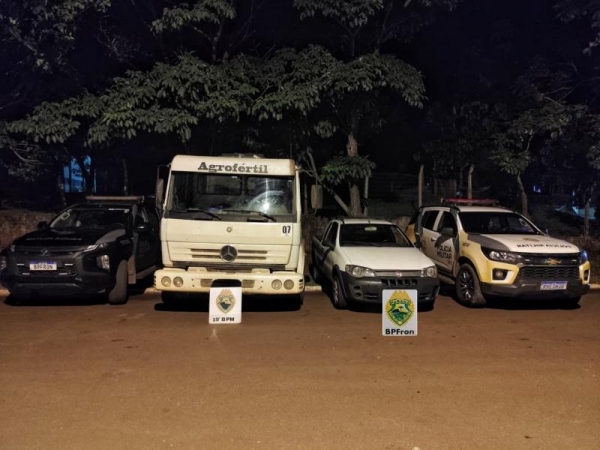 Dois homens foram presos por furto qualificado. O caminhão foi recuperado e o veículo utilizado como batedor foi apreendido. Também foram apreendidos dois aparelhos celulares.
