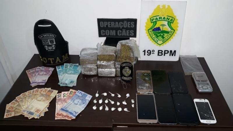 Na residência havia um casal, e após buscas com o cão farejador Boris, foram localizados vários tabletes de maconha (2,69 kg), 19 buchas de cocaína e quase R$ 800,00, além de sete celulares e uma balança de precisão.