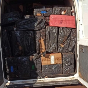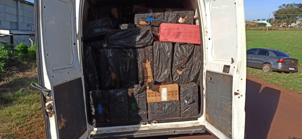 Ao abrir o compartimento traseiro da van foi constatado que se tratava de cigarros contrabandeado do Paraguai e o veículo Voyage também estava abarrotado de cigarros.