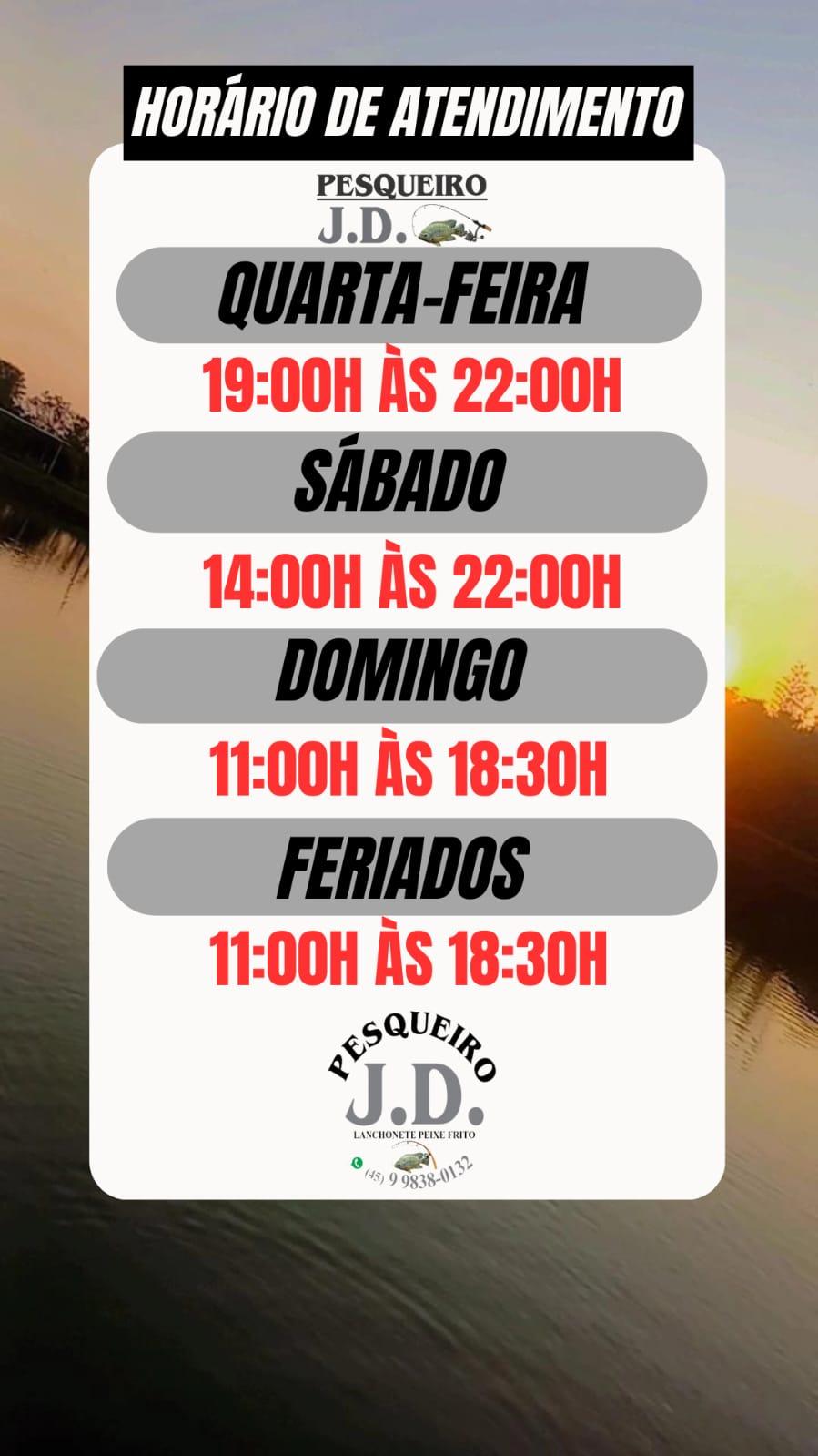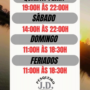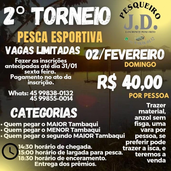 Neste domingo 02 de fevereiro acontece o 2º Torneio de Pesca Esportiva no Pesqueiro JD, para você que gosta de pescar e não quer levar o peixe é uma ótima opção e ainda pode levar um um prêmio para casa, teremos a categoria de 1°, 2° e 3° lugar, e ainda vários prêmios que serão sorteados entre os participantes.