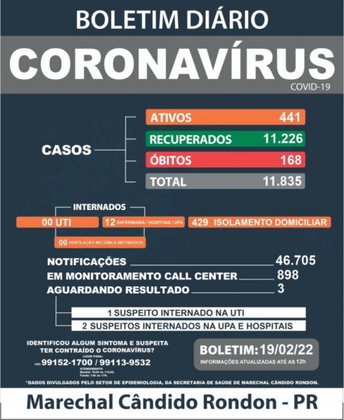 A Secretaria de Saúde de Marechal Cândido Rondon, através do setor de epidemiologia, divulgou no início da tarde deste sábado (19), o boletim diário dos casos de Covid-19 no município.