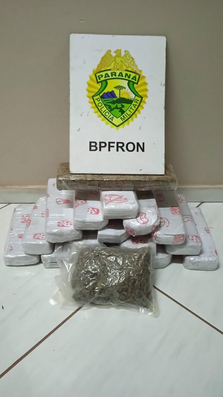 No bagageiro do veículo foi encontrado uma mala contendo 16 tabletes de substância análoga a maconha totalizando 10,600 kg da droga e um pacote a vácuo contendo 300 gramas de substância análoga a maconha tipo capulho.