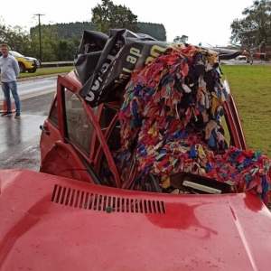 Segundo o que foi informado no local para reportagem o acidente aconteceu quando a carreta trafegava no sentido a Toledo e o Fiat Uno ao cruzar o trevo foi atingido pela carreta que não conseguiu frear a tempo.