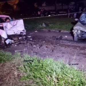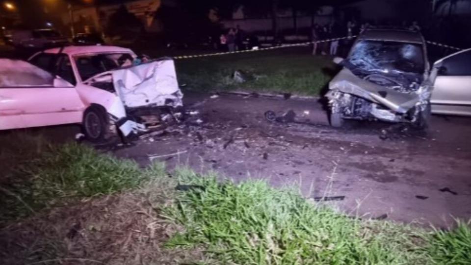 Os automóveis colidiram frontalmente. Uma câmera de segurança registrou o momento da batida quando um dos veículos invadiu a pista contrária.