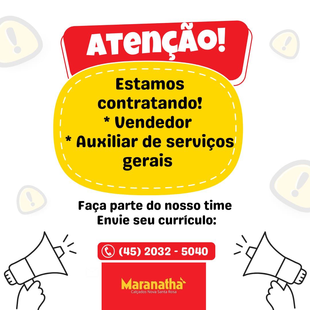 A Maranatha Calçados de Nova Santa Rosa está abrindo duas oportunidades de trabalho para a função de Vendedor e Auxiliar de Serviços Gerais.