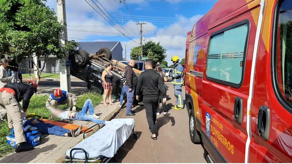 Duas pessoas ficaram feridas após caminhonete capotar em acidente de trânsito, na manhã desta quinta-feira (05), no bairro Alto Alegre em Cascavel.