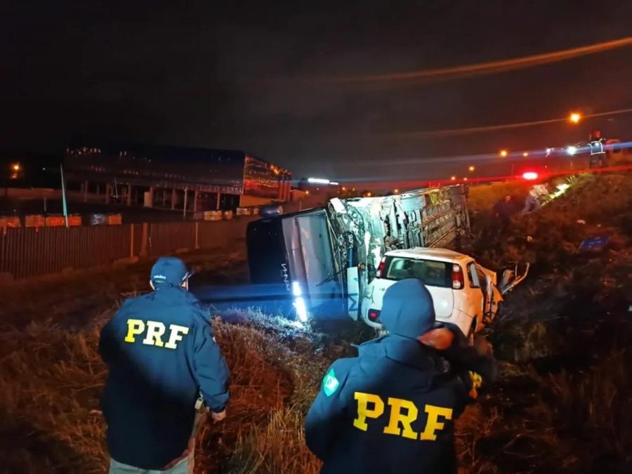De acordo com a Polícia Rodoviária Federal (PRF), o veículo trafegava pela contramão da rodovia e bateu de frente com o ônibus, que tombou em seguida.