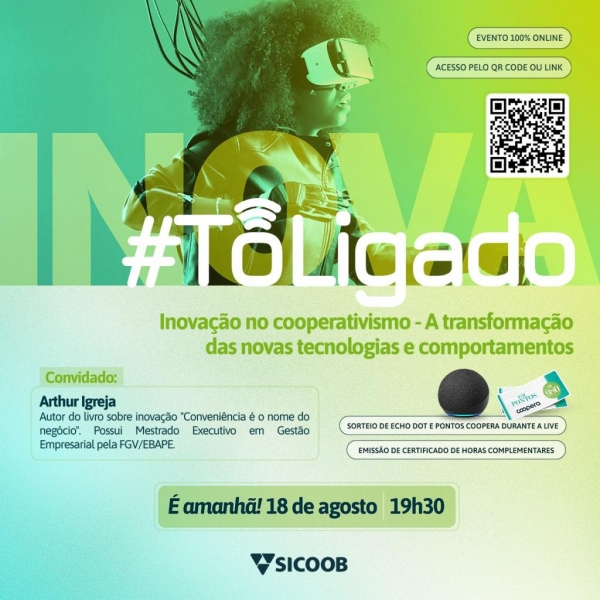 No próximo dia 18 de agosto, às 19h30, a cooperativa irá promover o #TôLigado, um bate-papo que contará com a participação do escritor e palestrante, Arthur Igreja, para falar sobre “Inovação no cooperativismo – a transformação das novas tecnologias e comportamentos”.