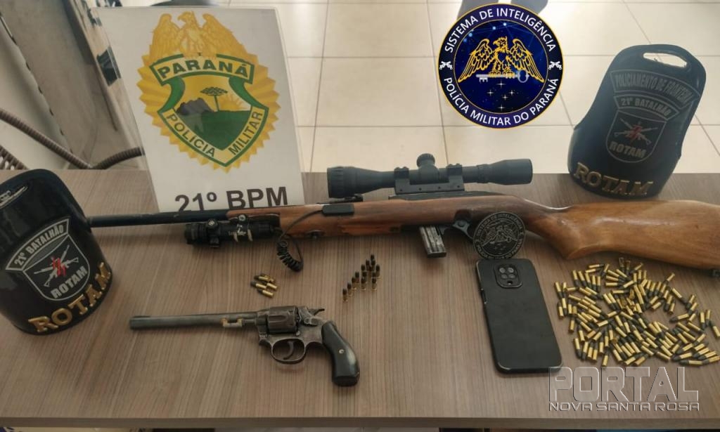 Durante buscas na residência do criminoso, os policiais localizaram, além da pistola 380 utilizada no confronto, um revólver calibre 22 e um rifle calibre 22, além de diversas munições cal 22.