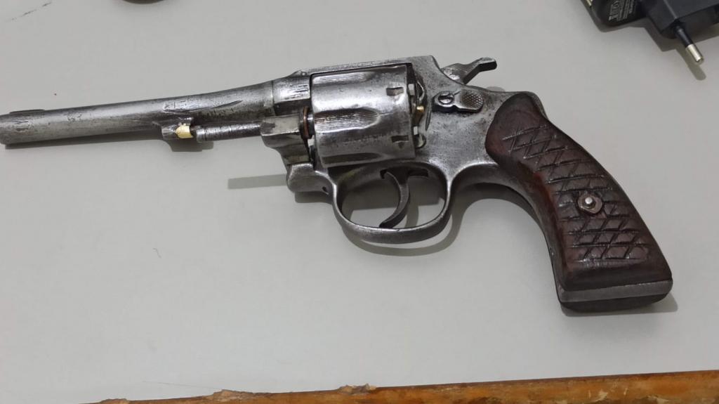 Foi localizado no terreno ao lado, um revólver cal. 32 de numeração sem munições que o elemento tentou dispensar durante a fuga.