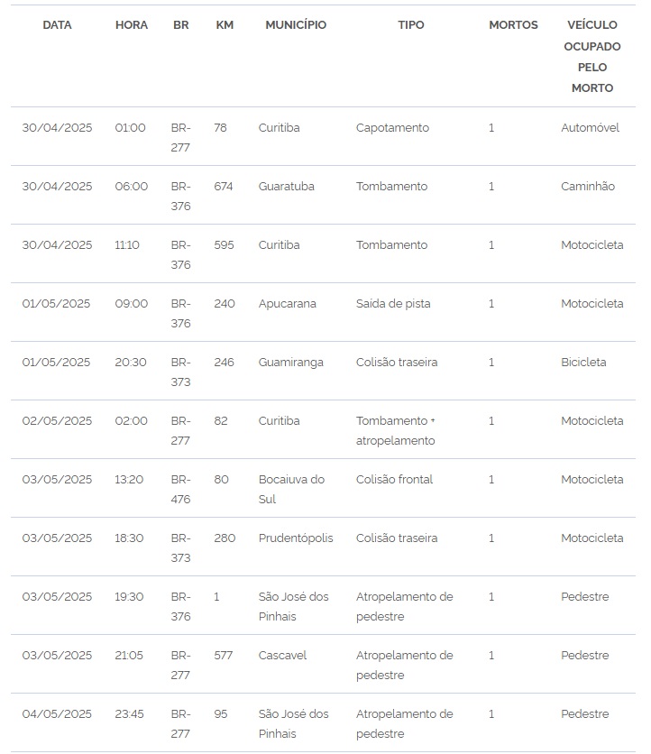 Pedestres também estiveram entre as vítimas, com três atropelamentos registrados nas cidades de Cascavel e São José dos Pinhais. As três mortes ocorreram em período noturno, apesar de que em dois locais havia iluminação artificial.