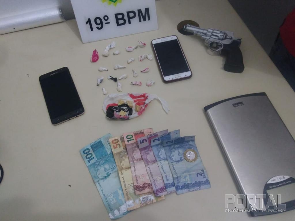 Foi solicitado uma viatura com uma policial feminina, a qual, após efetuar buscas na suspeita de 33 anos, encontrou uma pedra de crack envolta em uma sacola plástica e a quantia de R$ 20,00 (vinte reais), e com o suspeito, a importância de R$ 50,00 (cinquenta reais).