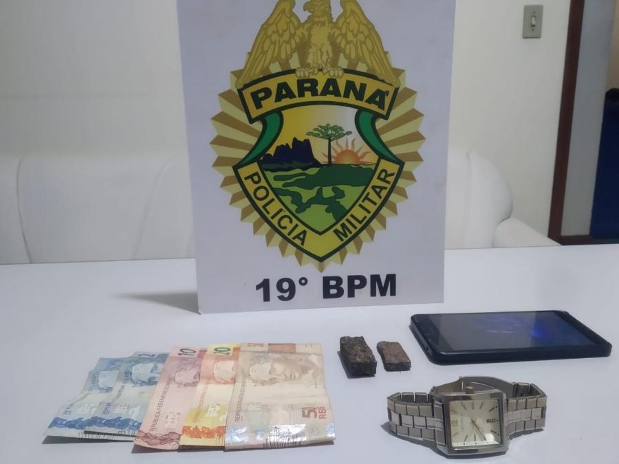 Por volta das 18h30, de posse das informações repassadas, foi realizado patrulhamento nas proximidades da praça a fim de localizar o denunciado. Após alguns minutos foi realizada a abordagem em um masculino, o qual se identificou e informou que estava com uma pequena porção de maconha e R$ 84,00.