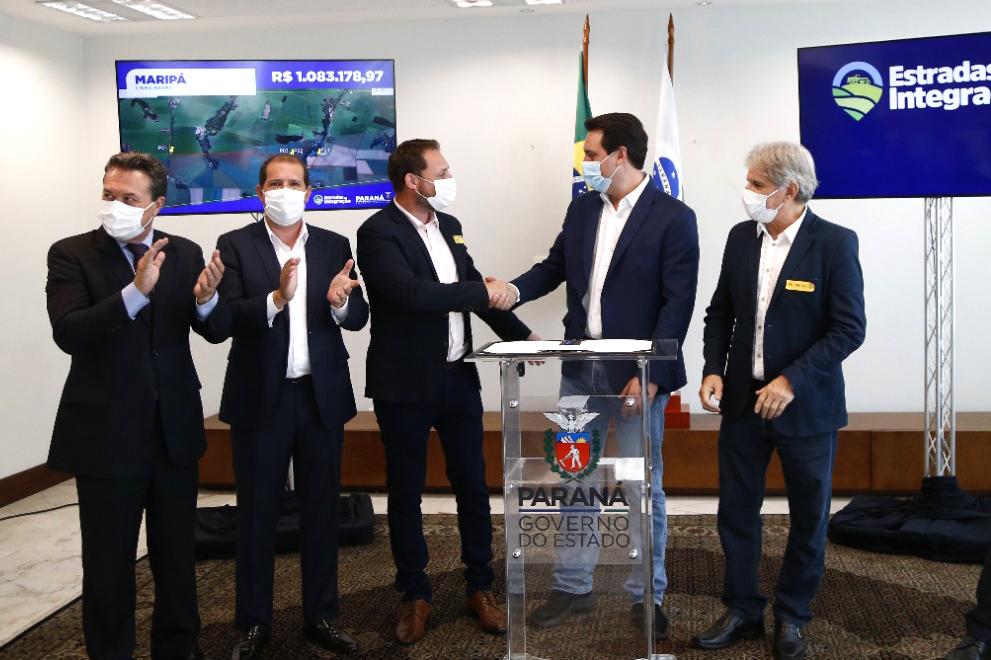 O prefeito Rodrigo Schanoski assinou na manhã desta terça-feira (9), no Palácio Iguaçu, um convênio no valor de R$ 1.083.178,97 para pavimentação poliédrica na estrada de divisa entre Maripá e Palotina. Localizada na Linha Kennedy, a MR 318 receberá 3.820 metros de extensão de calçamento poliédrico. O convênio faz parte do Programa Estradas da Integração da SEAB, que tem o objetivo de melhorar a trafegabilidade na zona rural.