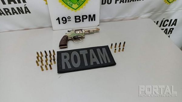 Foram realizadas buscas, e localizado a arma de fogo jogada próximo ao meio fio da via, sendo um revólver calibre .22 da marca Rossi, com capacidade de 7 tiros, carregado com 3 munições deflagradas e 4 intactas.