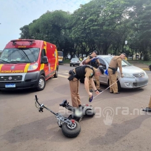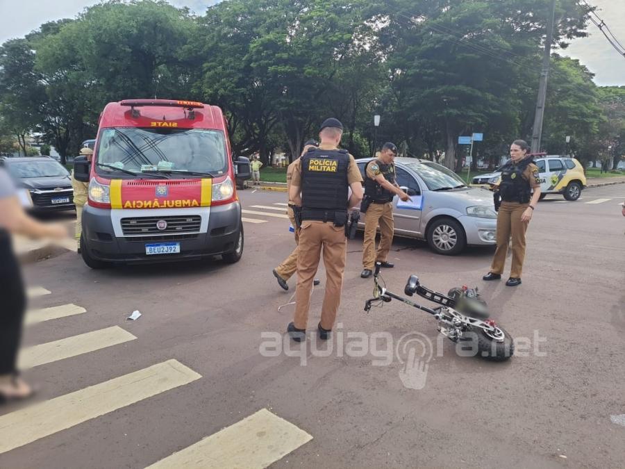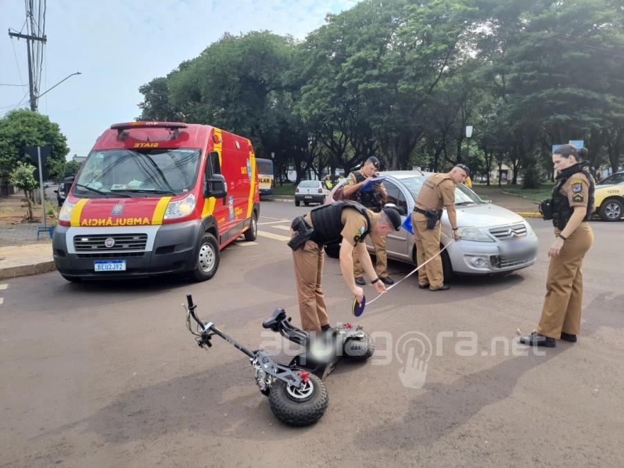 No patinete que seguia pela rua Paraná, estava um idoso de 83 anos. Ele sofreu queda e foi atendido pelos bombeiros com ferimentos leves.