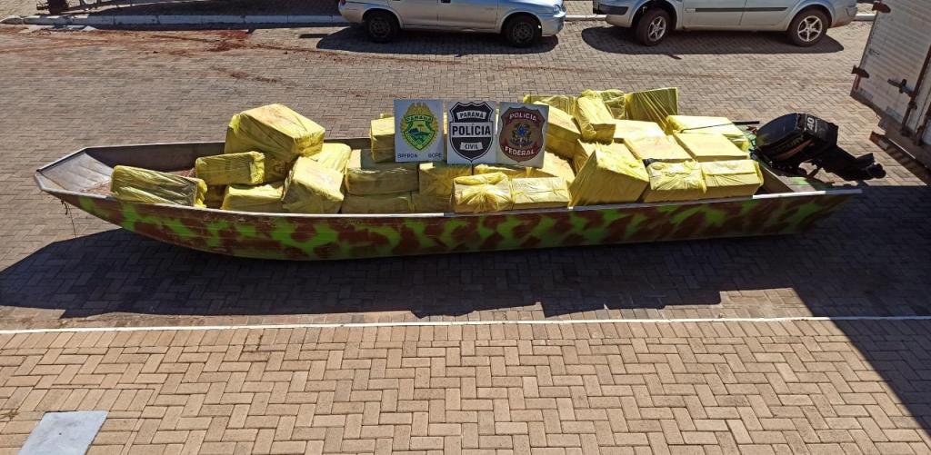 A eficiente ação integrada entre Polícia Federal, BPFron/PMPR e GOA/PCPR resultou na apreensão de uma embarcação de alumínio equipada com motor Mercury 40hp e um caminhão Mercedes Benz 1113 carregado com aproximadamente 50.000 maços de cigarros contrabandeados.
