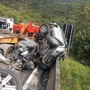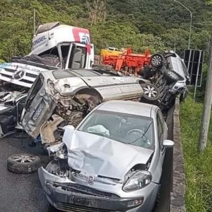 Um engavetamento com um caminhão e 14 carros no trecho da BR-376, em Guaratuba, litoral do Paraná, deixou uma pessoa em estado grave e cinco com feridentos moderados no final da manhã deste domingo (2), de acordo com a Polícia Rodoviária Federal (PRF).