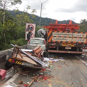 A Arteris informou que, junto com equipes da Polícia Rodoviária Federal (PRF) e Corpo de Bombeiros, atendem a ocorrência e realizam a limpeza da pista.