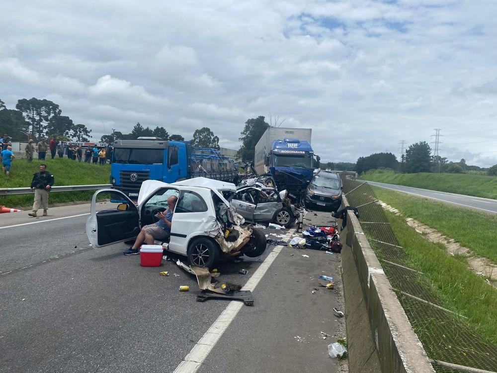 Um engavetamento envolvendo seis veículos interditou o km 89 da BR-116, em Piraquara. A interdição ocorre no sentido sul da rodovia, desde as 11h55. Até a última atualização desta reportagem não havia previsão de liberação.