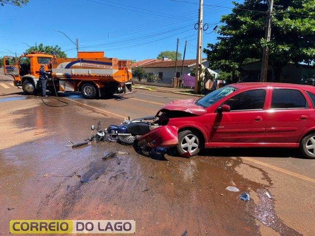 Por volta do meio-dia desta sexta-feira (31), um grave acidente de trânsito foi registrado na rua Ângelo Cattani, no perímetro urbano da PR-317, em Santa Helena, envolvendo uma motocicleta Honda/CG125 e um GM/Corsa.