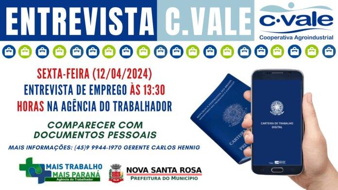 A Prefeitura de Nova Santa Rosa através da Agência do Trabalhador informa que hoje (12°) a partir das 13h30m acontecem entrevistas de emprego para interessados em trabalhar na C.Vale.