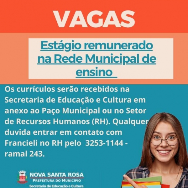 A Prefeitura de Nova Santa Rosa, por meio da Secretaria de Educação e Cultura, informa que busca estagiários para atuar na rede municipal de ensino: escolas e centros municipais de educação infantil (CMEI).