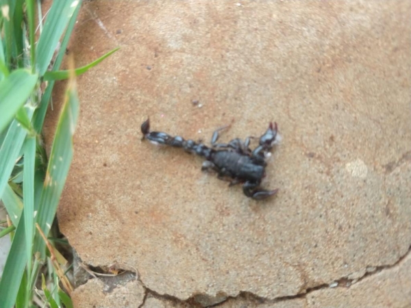 Ela encontrou ontem (20) em sua residência, em meio ao jardim da casa, localizada no Loteamento Dona Olinda um escorpião preto, O Tityus bahiensis, também conhecido como escorpião-preto mede 6 cm de comprimento, tem coloração muito escura e patas castanhas. A espécie é responsável, no Brasil, pelo maior número de casos de acidentes escorpiônicos em áreas rurais, ele costuma se alimentar de baratas, grilos, tenébrios, aranhas e até larvas de insetos.