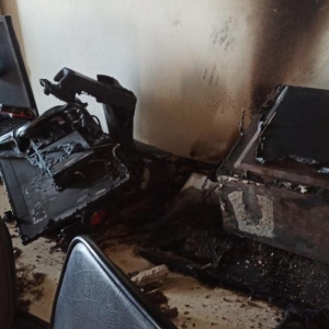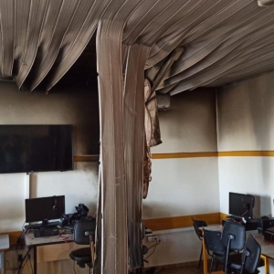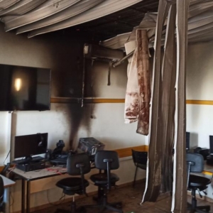 O incêndio começou quando a professora que dá aula de informática entrou na sala e ligou o ar condicionado e em seguida um curto circuito iniciou as chamas que queimou parte do forro de PVC, um computador e parcialmente uma TV de 42 polegadas.
