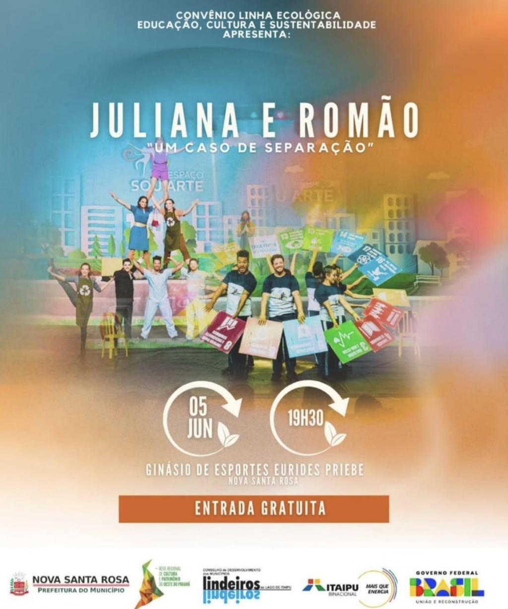 A Rede Regional de Cultura e Patrimônio do Oeste do Paraná, em parceria com a Prefeitura de Nova Santa Rosa, promove nesta quinta-feira (5), às 19h30, o espetáculo “Juliana e Romão – um caso de separação”, apresentado pelo grupo Espaço SOU ARTE.
