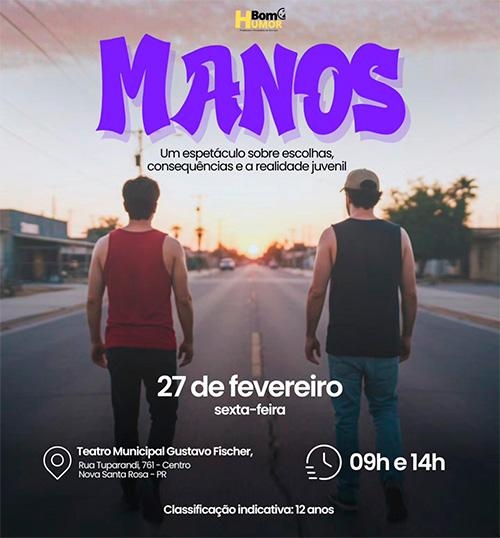 No próximo dia 27 de fevereiro (sexta-feira), o Teatro Municipal receberá a apresentação do espetáculo “Manos”. Voltado especialmente ao público adolescente, o projeto busca estimular o diálogo sobre escolhas, responsabilização e consequências, por meio de uma abordagem sensível e próxima da realidade juvenil.