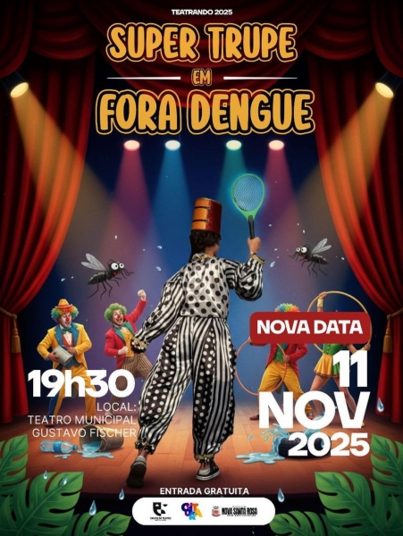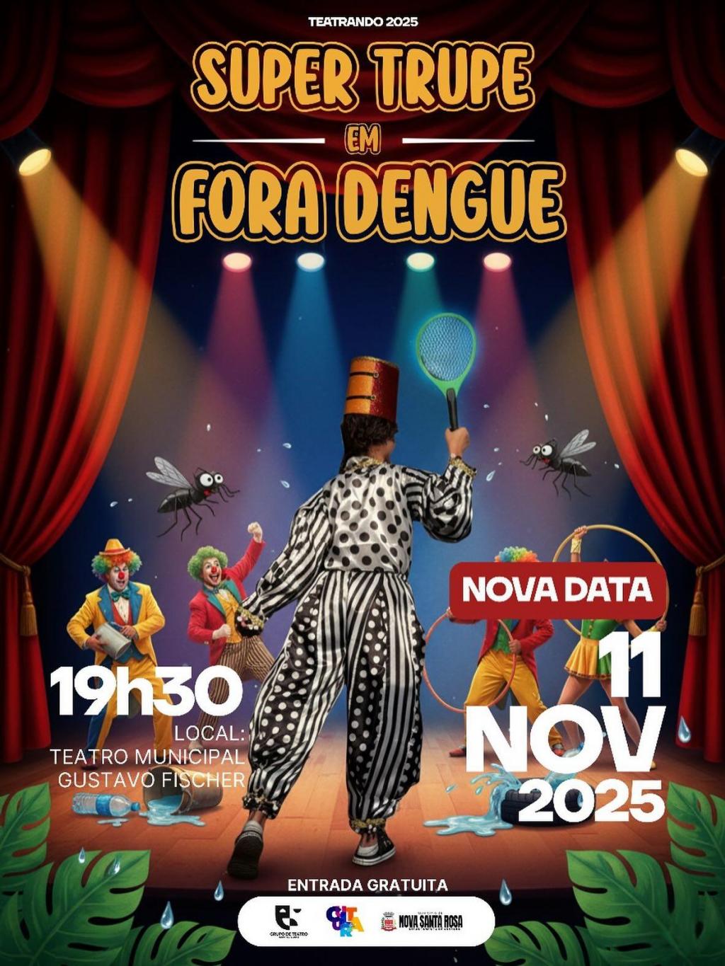 O município de Nova Santa Rosa recebe nesta terça-feira (11), o espetáculo “Super Trupe em: Fora Dengue”, uma apresentação teatral educativa que integra o projeto Teatrando 2025. A atividade tem entrada gratuita e será realizada no Teatro Municipal Gustavo Fischer, às 19h30.
