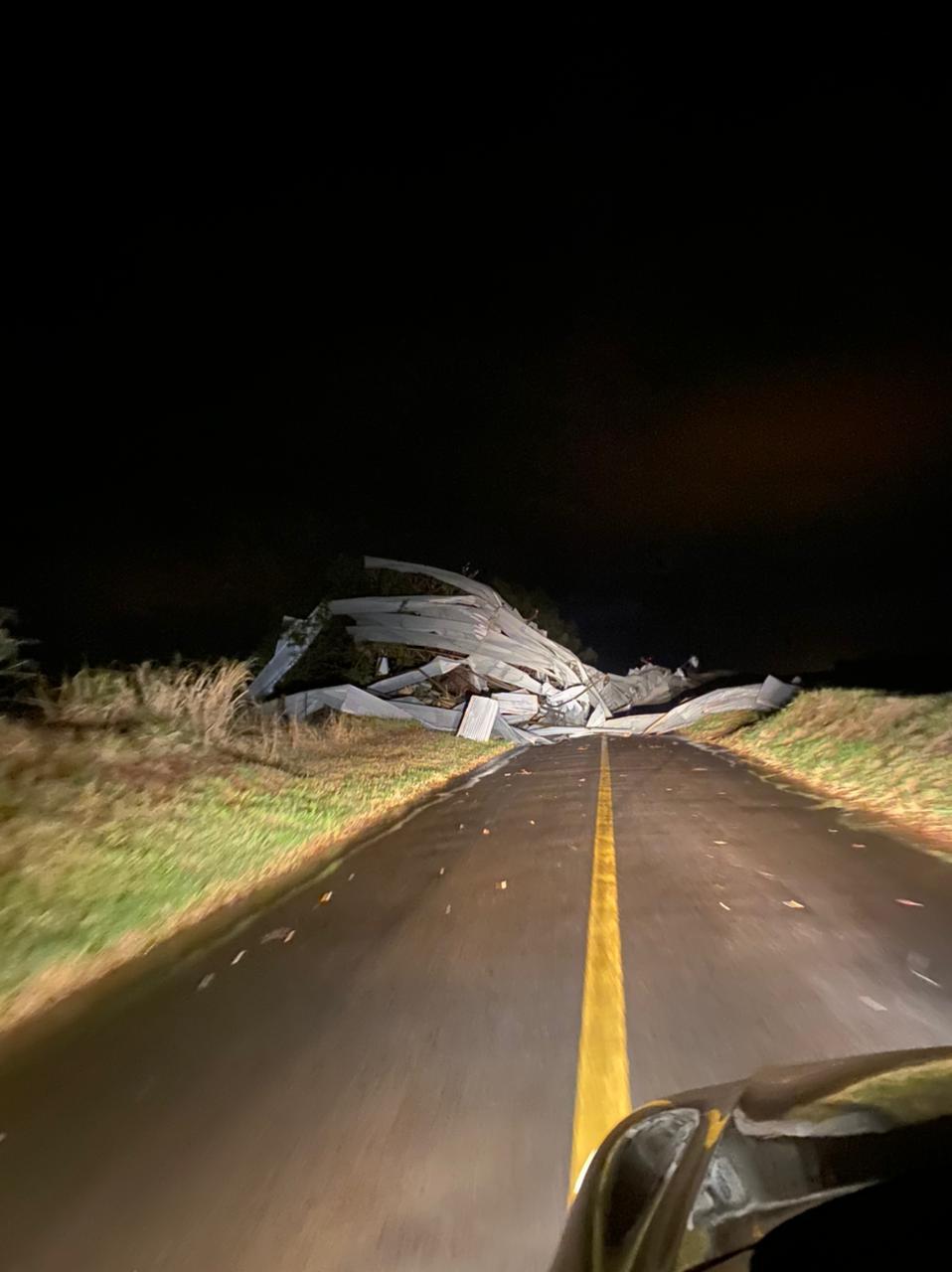 O Posto de Brigada Comunitária de Loanda no Paraná está comunicando que a PR 567, rodovia que liga o município de Porto Rico à Santa Cruz de Monte Castelo, proximidades com a divisa do Mato Grosso do Sul encontra-se interditada temporariamente em virtude da estrutura de um barracão que foi arremessada para a rodovia com o vento na madrugada de sábado (22).