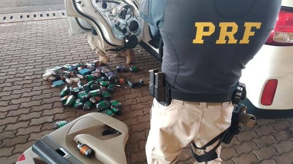A equipe da PRF (Polícia Rodoviária Federal) realizou a abordagem dos ocupantes do veículo Kia Sorento. A dupla apresentou nervosismo e então foi levada à Unidade Operacinal para uma busca minuciosa.
