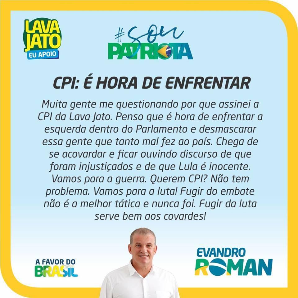 “Muita gente me questiona porque assinei a CPI da Lava Jato. Penso que é hora de enfrentar a esquerda dentro do Parlamento e desmascarar essa gente que tanto fez mal ao País. Chega de se acovardar e ficar ouvindo discurso de que foram injustiçados e de que Lula é inocente. Vamos para a guerra. Querem CPI? Não tem problemas. Vamos para a luta! Fugir do embate não é a melhor tática e nunca foi”, disse o parlamentar.