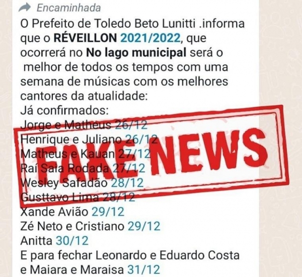 Nos últimos dias, uma mensagem referente às atrações do fim de ano de Toledo vem sendo encaminhada no WhatsApp e demais redes sociais. Nela, é anunciado uma série de artistas que, de acordo com ela, se apresentarão na cidade. Para quem se animou vendo o nome daqueles artistas, terá que mudar um pouco seus planos. Essa mensagem é falsa!
