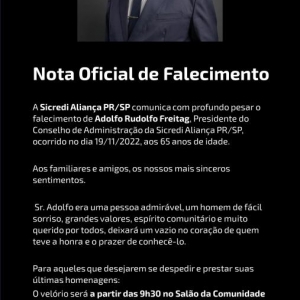 A Sicredi Aliança PR/SP comunica com profundo pesar o falecimento de Adolfo Rudolfo Freitag, Presidente do Conselho de Administração da Sicredi Aliança PR/SP, ocorrido no dia 19/11/2022, aos 65 anos de idade.
