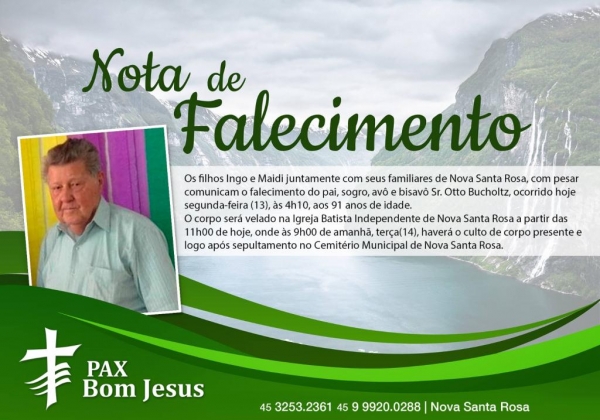 Os filhos Ingo e Maidi juntamente com seus familiares de Nova Santa Rosa, com pesar comunicam o falecimento do pai, sogro, avô e bisavô Sr. Otto Bucholtz, ocorrido hoje segunda-feira (13), às 4h10, aos 91 anos de idade.