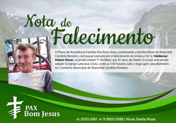 O Plano de Assistência Familiar Pax Bom Jesus, juntamente com a família Ittner de Marechal Cândido Rondon, com pesar, comunicam o falecimento do irmão e tio Sr. Valdemar Valmir Ittner, ocorrido ontem, 1º de Maio, aos 47 anos de idade.