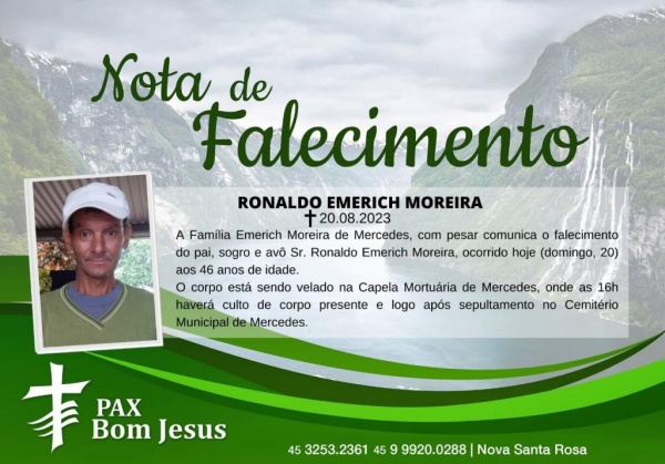 Pax Bom Jesus de Nova Santa Rosa juntamente com a Família Emerich Moreira de Mercedes, com pesar comunica o falecimento do pai, sogro e avô Sr. Ronaldo Emerich Moreira, ocorrido hoje (domingo, 20) aos 46 anos de idade.