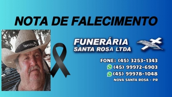 A esposa Edite, filha Rosane, netos Juliana e Everton e família Baumgardt de Nova Santa Rosa, com pesar, comunicam o falecimento do esposo, pai, avô e bisavô, Sr. Sigfried Baumgardt, ocorrido hoje aos 78 anos.