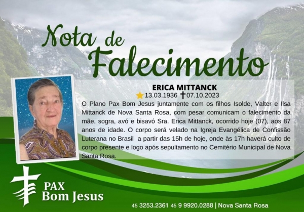 O Plano Pax Bom Jesus juntamente com os filhos Isolde, Valter e Ilsa Mittanck de Nova Santa Rosa, com pesar comunicam o falecimento da mãe, sogra, avó e bisavó Sra. Erica Mittanck, ocorrido hoje (07), aos 87 anos de idade.