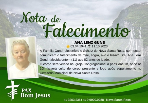 A Família Gund, Liesenfeld e Schulz de Nova Santa Rosa, com pesar comunicam o falecimento da mãe, sogra, avó e bisavó Sra. Ana Lenz Gund, falecida ontem (11) aos 82 anos de idade.