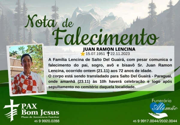 A Família Lencina de Salto Del Guairá, com pesar comunica o falecimento do pai, sogro, avô e bisavô Sr. Juan Ramon Lencina, ocorrido ontem (21.11) aos 72 anos de idade.