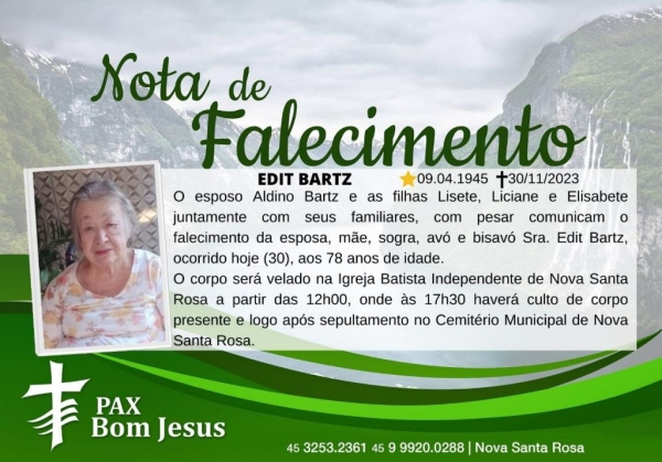 O esposo Aldino Bartz e as filhas Lisete, Liciane e Elisabete juntamente com seus familiares, com pesar comunicam o falecimento da esposa, mãe, sogra, avó e bisavó Sra. Edit Bartz, ocorrido hoje (30), aos 78 anos de idade.