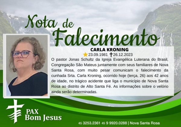 O pastor Jonas Schultz da Igreja Evangélica Luterana do Brasil, Congregação São Mateus juntamente com seus familiares de Nova Santa Rosa, com muito pesar comunicam o falecimento da cunhada Srta. Carla Kroning, ocorrido hoje (terça, 26) aos 42 anos de idade, no trágico acidente que liga o município de Nova Santa Rosa ao distrito de Alto Santa Fé.