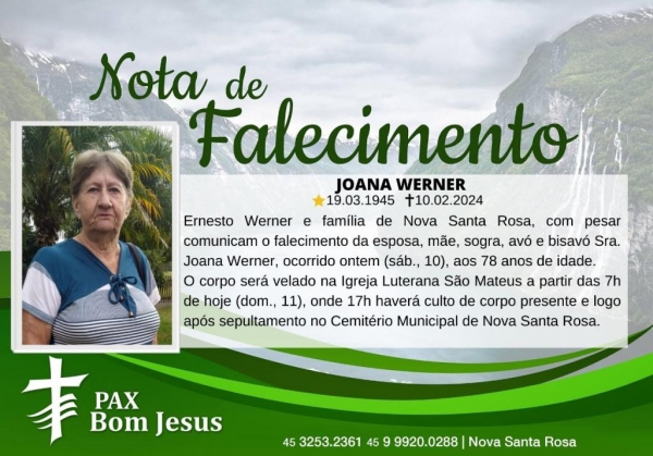 Ernesto Werner e família de Nova Santa Rosa, com pesar comunicam o falecimento da esposa, mãe, sogra, avó e bisavó Sra. Joana Werner, ocorrido ontem (sábado, 10), aos 78 anos de idade.