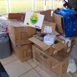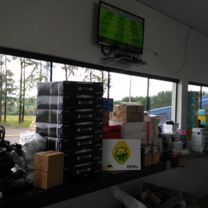 Após uma vistoria no interior da Van foi localizado grande quantidade de brinquedos, acessórios para celulares, vídeo games, celulares, rádios comunicadores, eletrônicos, massageadores, roteadores, carregadores para celulares.